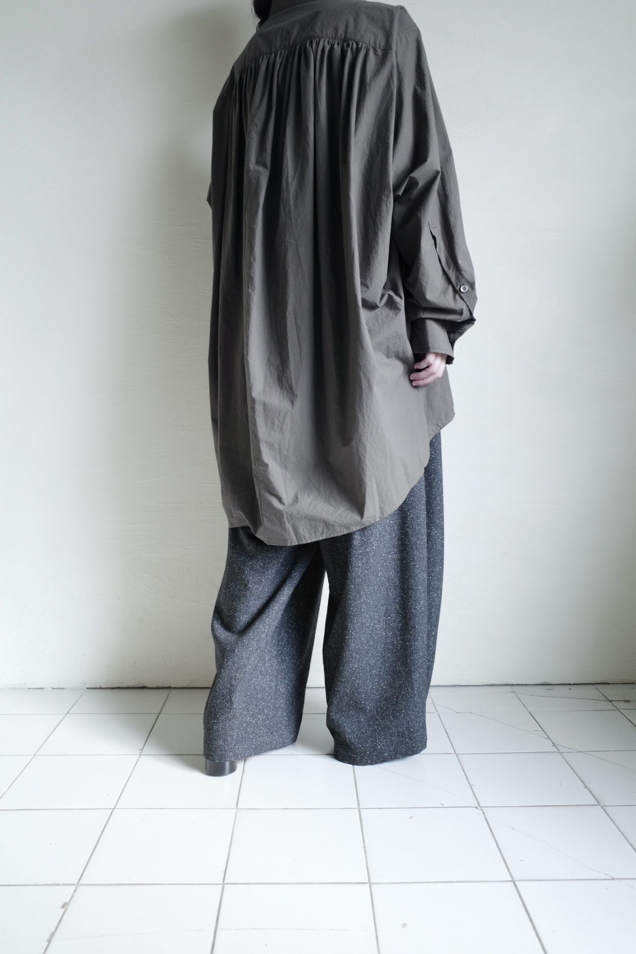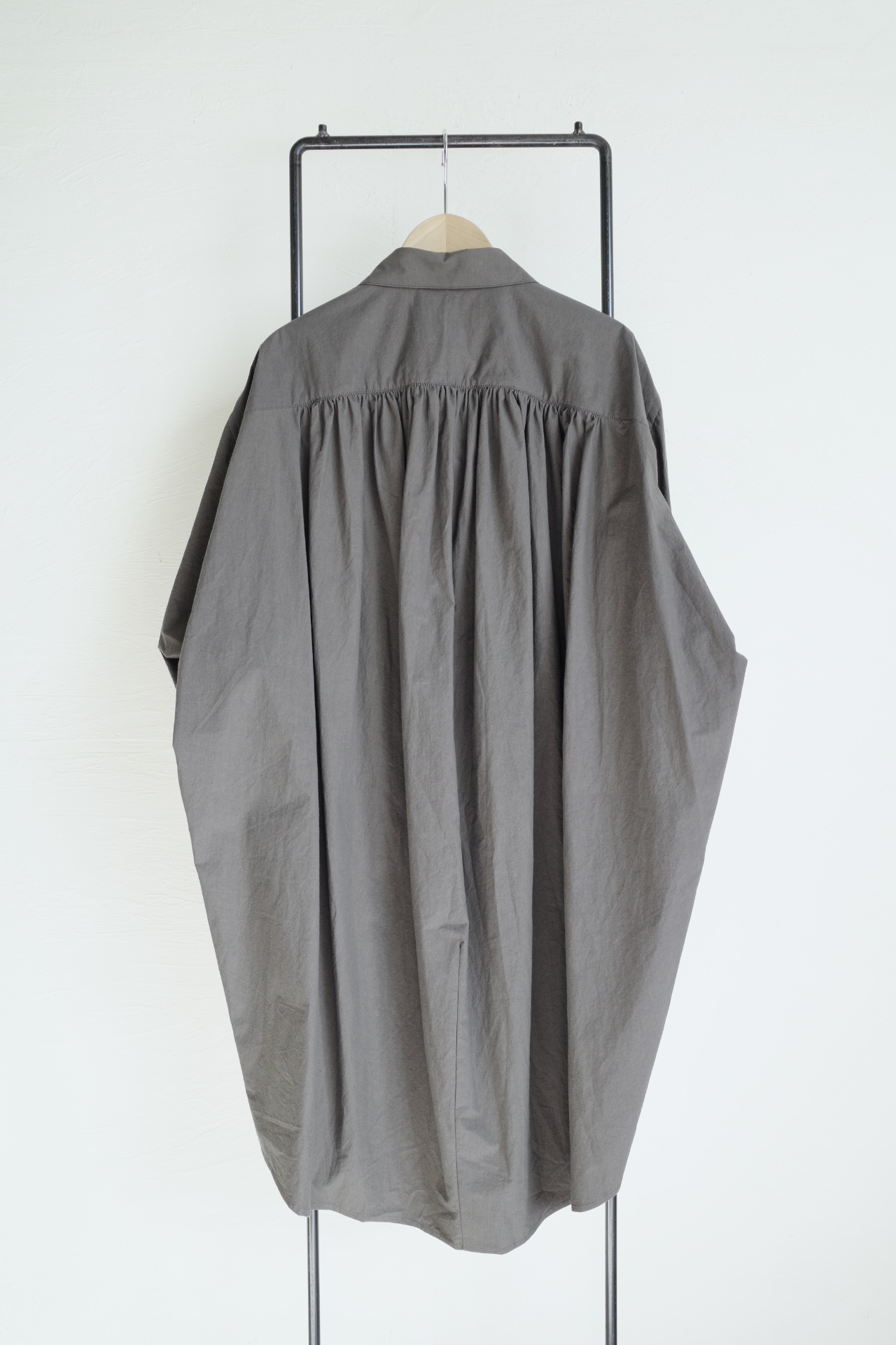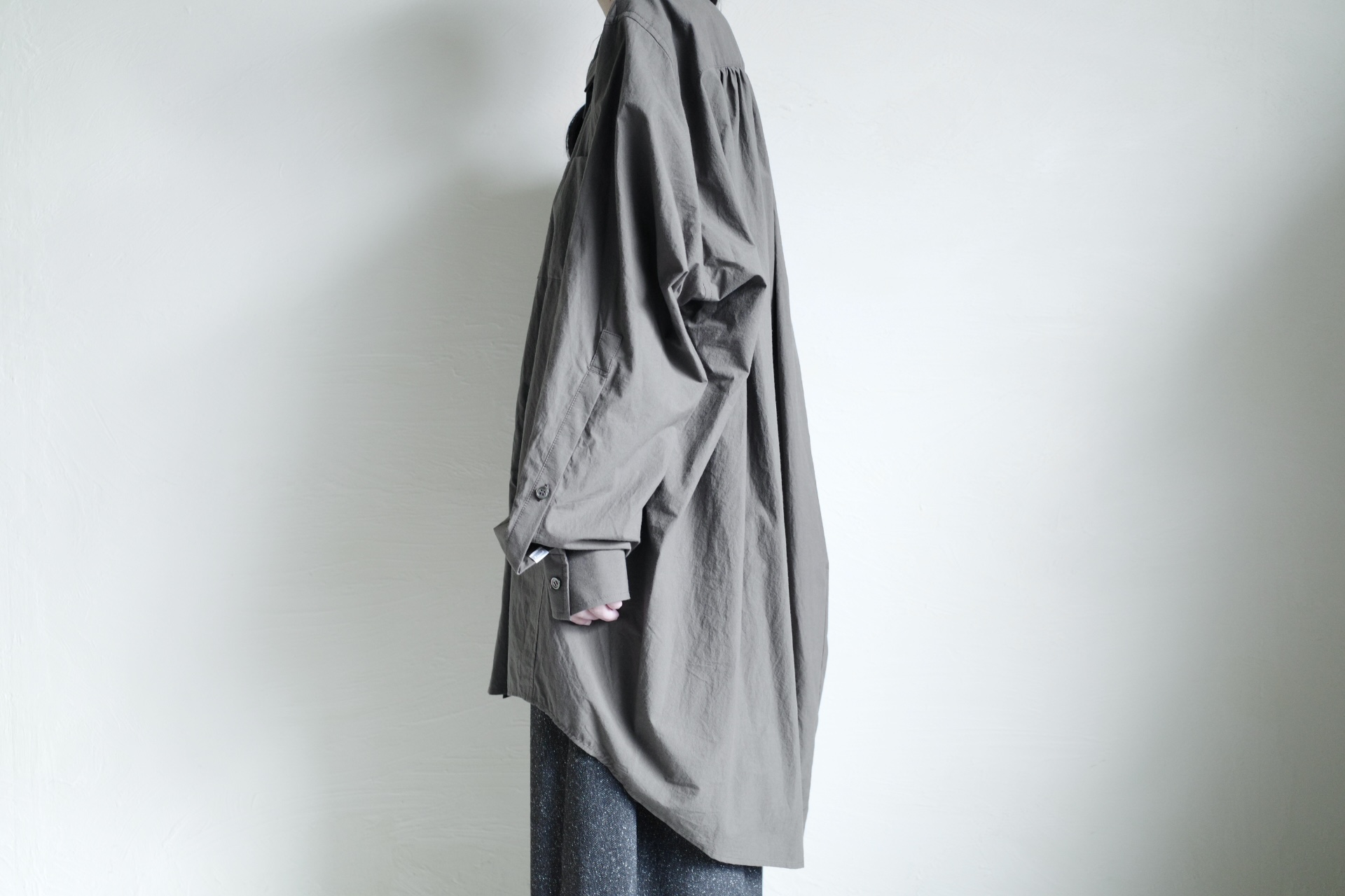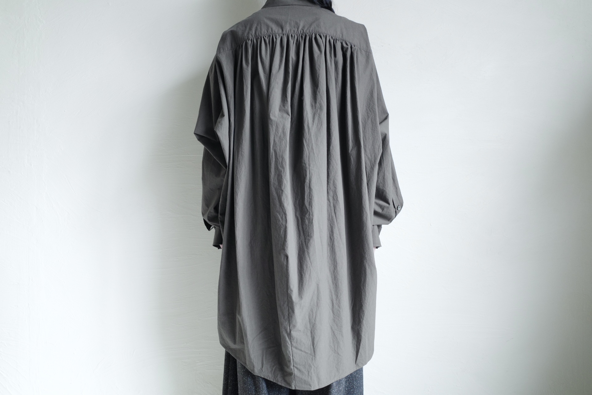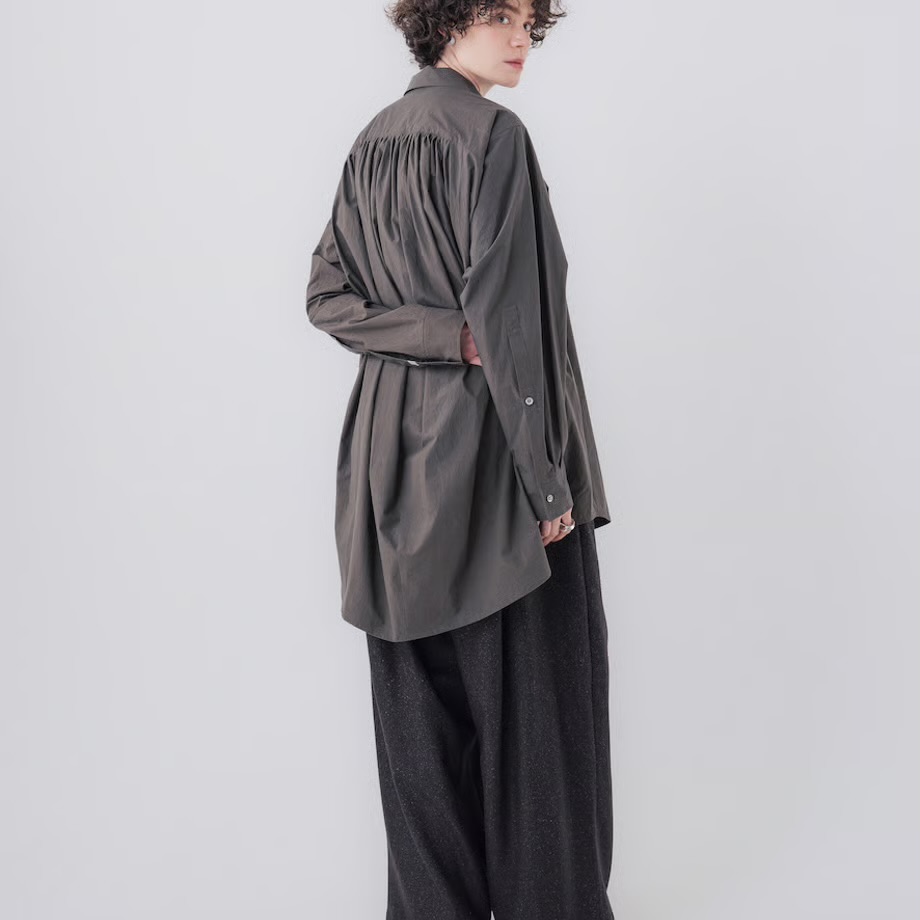 バックスタイルに大胆に施したギャザーが最大のポイントのオーバーシャツ。バック裾は少しダーツをとることで、ふんわりとした他にないバックスタイルを楽しんでいただけます。袖は大きく前に振り、前身頃を狭くすることで他にないシルエットが生まれています。肩や腕の動きにやさしく寄り添うパターンメイキング。身幅はたっぷり身体が泳ぐサイズ感。unisexアイテム。生地の特性状個々で色合い・サイズに若干差がある場合がありますご了承ください。