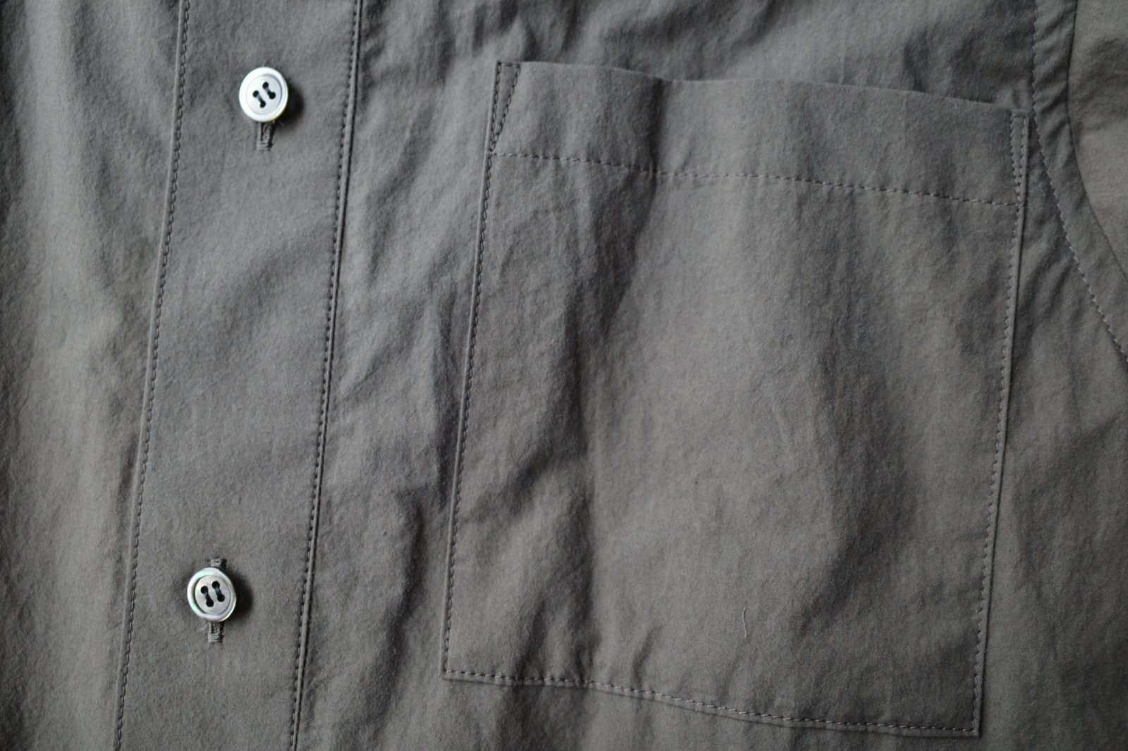 程よい肉感のあるコットン素材は、樹脂を付けてワッシャー仕上げをし、独特のぬめりや反発感のあるヴィンテージ風の風合いを表現したもの。細番手の高密度な生地を時間をかけてゆっくりもみほぐすことで、生地の膨らみやナチュラルなシボを最大限に表現しています。