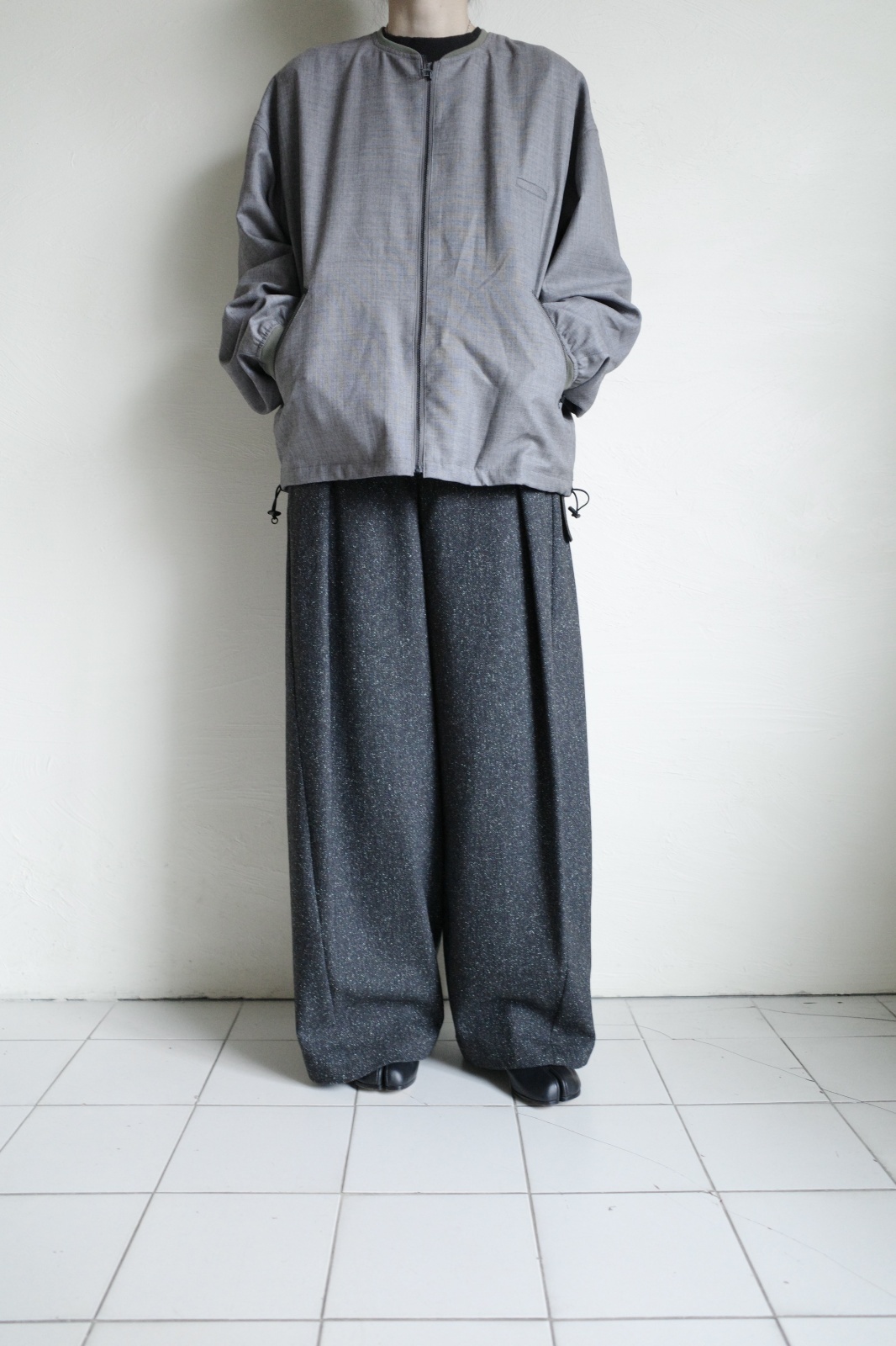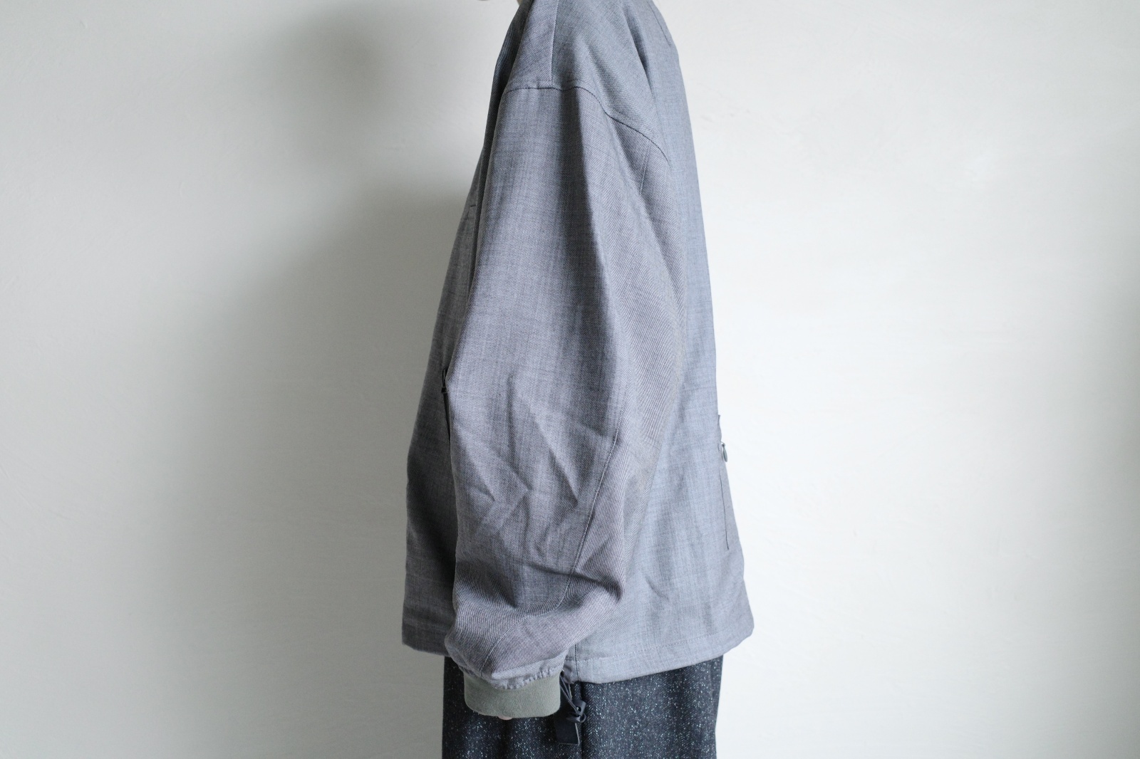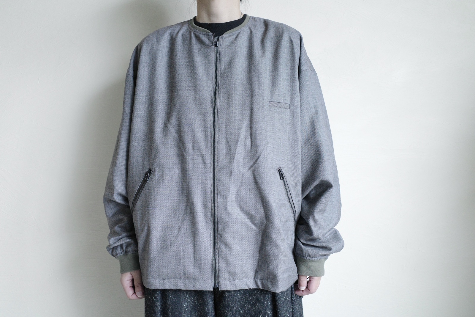 ノーカラーでミニマムなフォルム、裾元にゴムギャザーを入れ、膨らみのあるシルエットを描いたジップアップブルゾン。背面にポケットを配置。アイテムの個性を引き上げるデザインを閉じ込めました。胸元にはアイコン的ディテール「小さなポケット」のアクセントを加えています。フロントポケットはジップ付きで機能的。裏地もちゃんと全面に張ってあり通年着用可能です。UNISEXサイズ。生地の特性状個々で色合い・サイズに若干差がある場合がありますご了承ください。