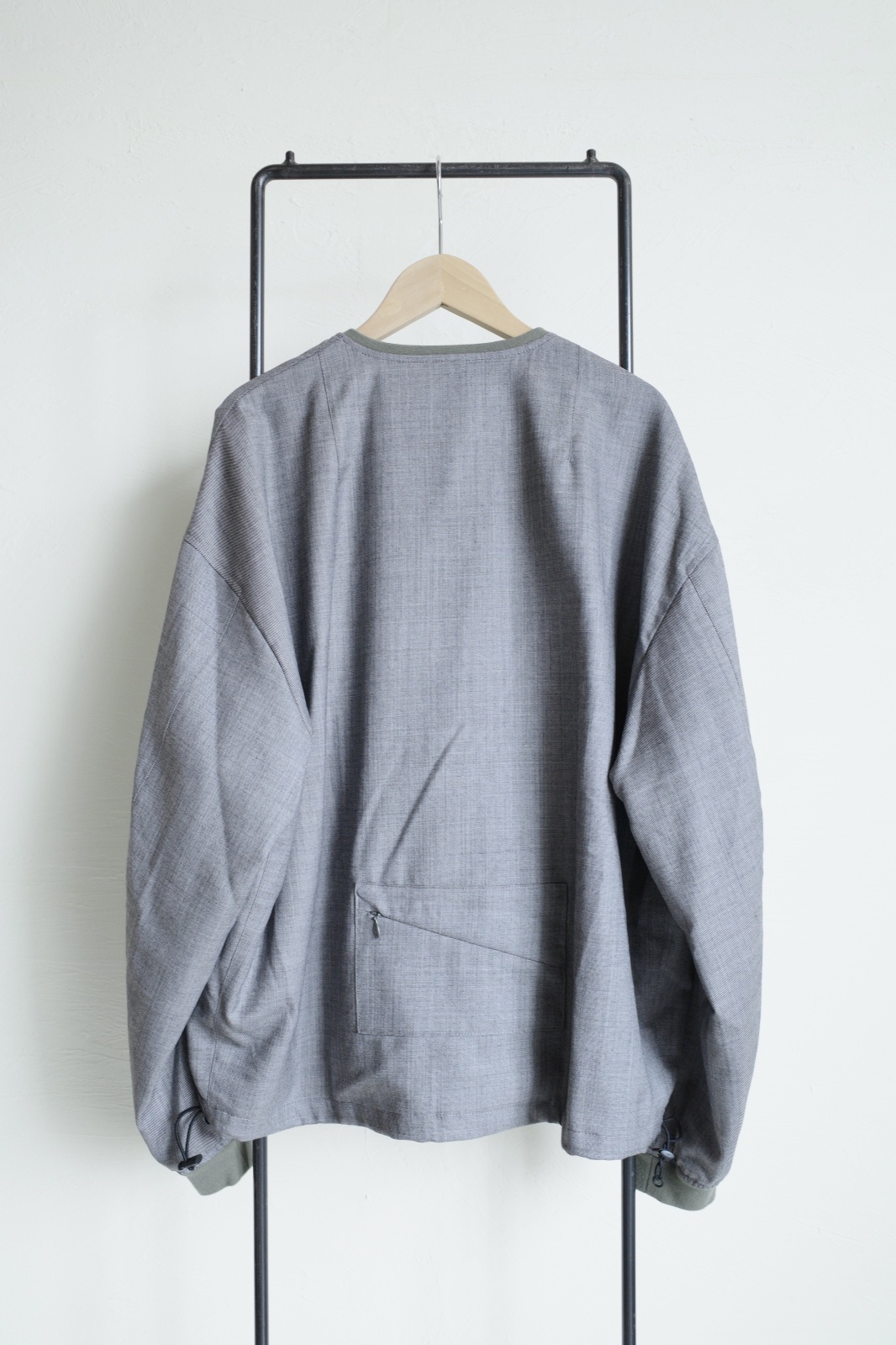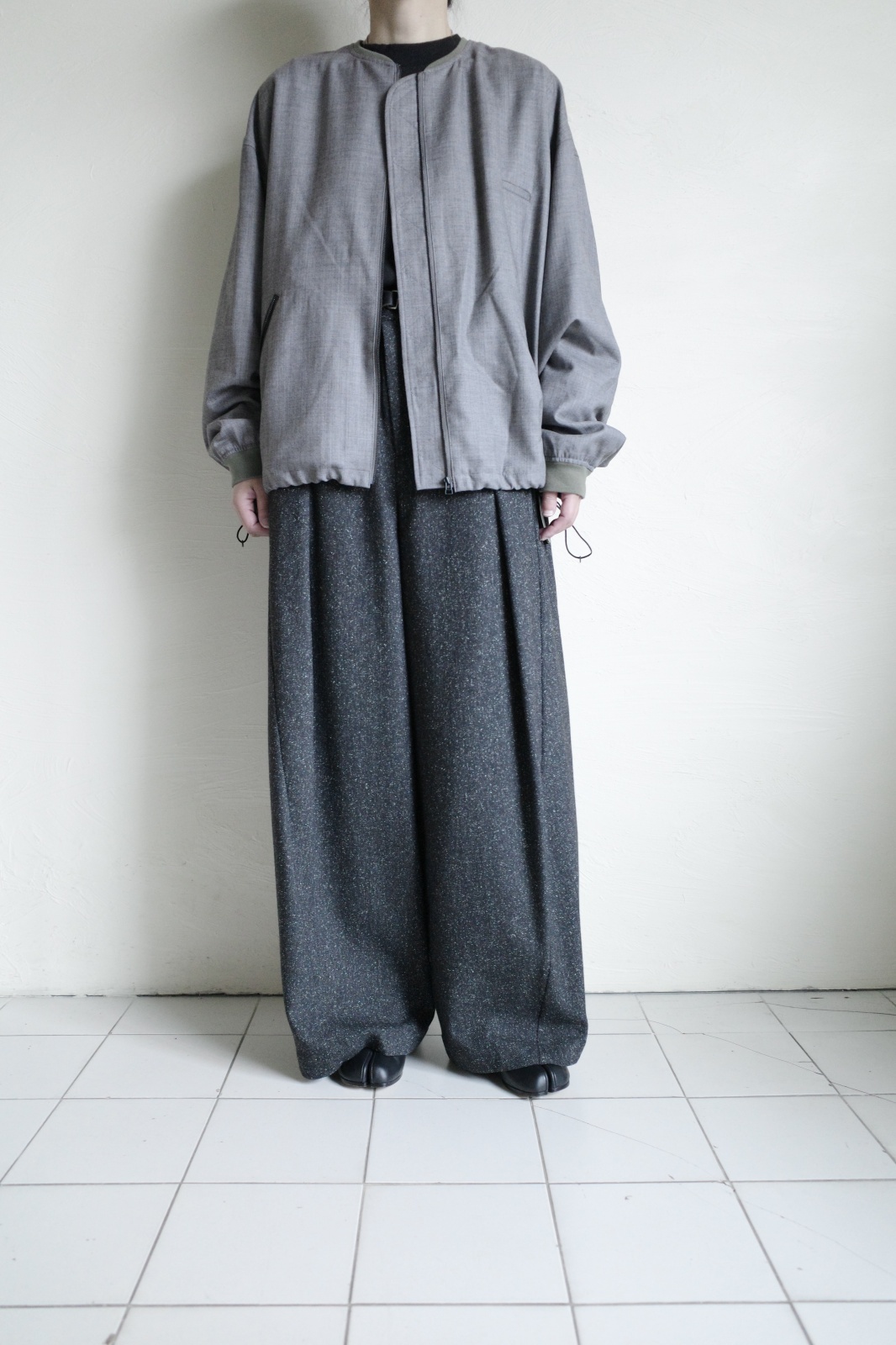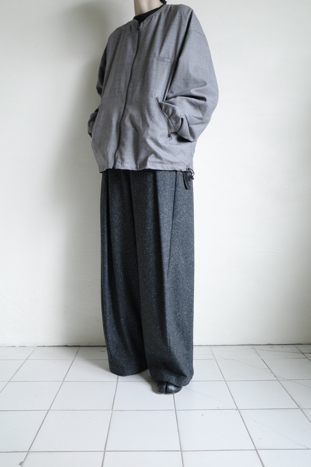 ノーカラーでミニマムなフォルム、裾元にゴムギャザーを入れ、膨らみのあるシルエットを描いたジップアップブルゾン。背面にポケットを配置。アイテムの個性を引き上げるデザインを閉じ込めました。胸元にはアイコン的ディテール「小さなポケット」のアクセントを加えています。フロントポケットはジップ付きで機能的。裏地もちゃんと全面に張ってあり通年着用可能です。UNISEXサイズ。生地の特性状個々で色合い・サイズに若干差がある場合がありますご了承ください。