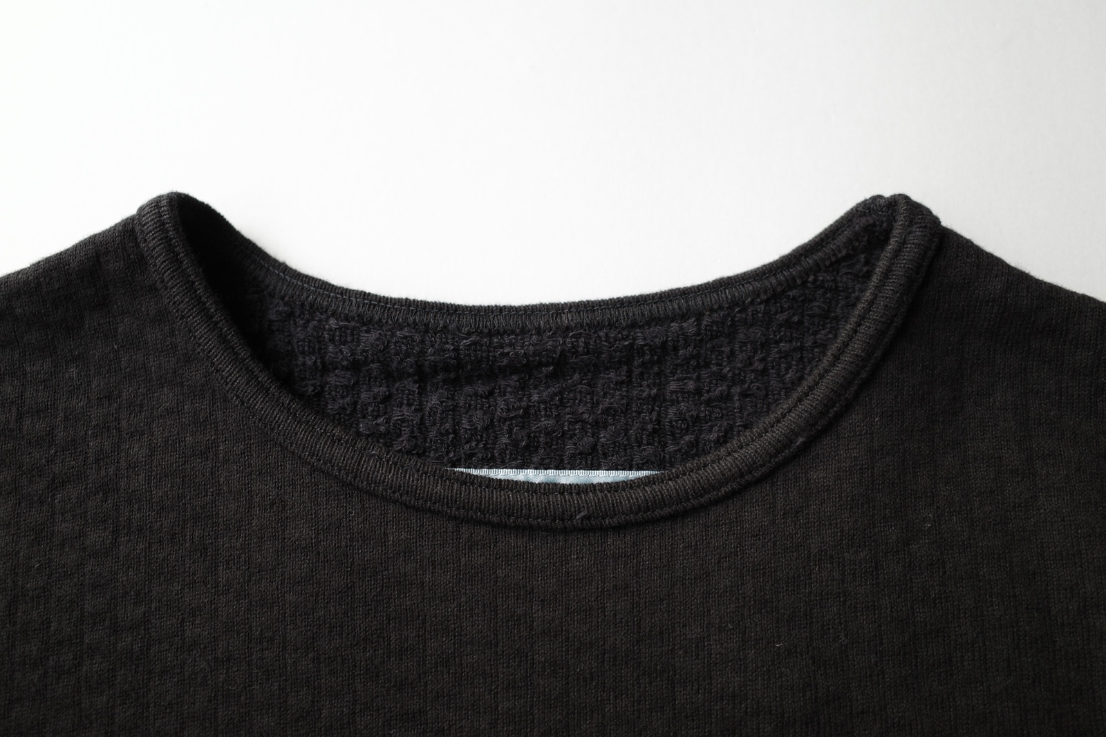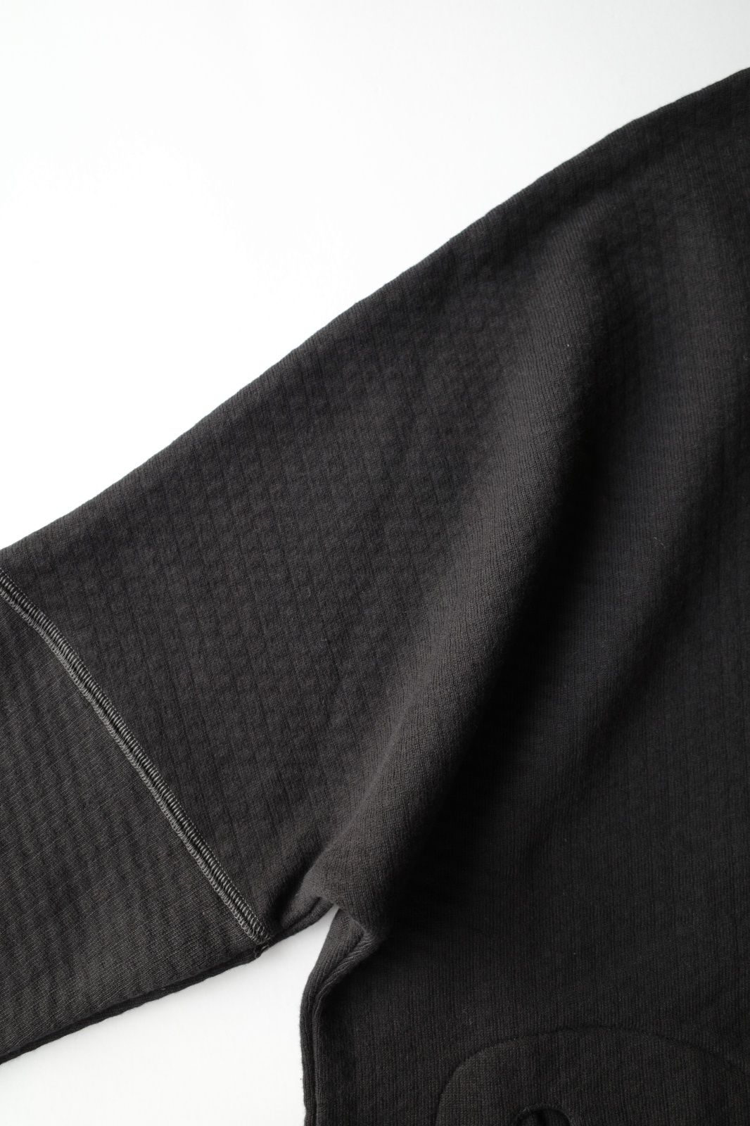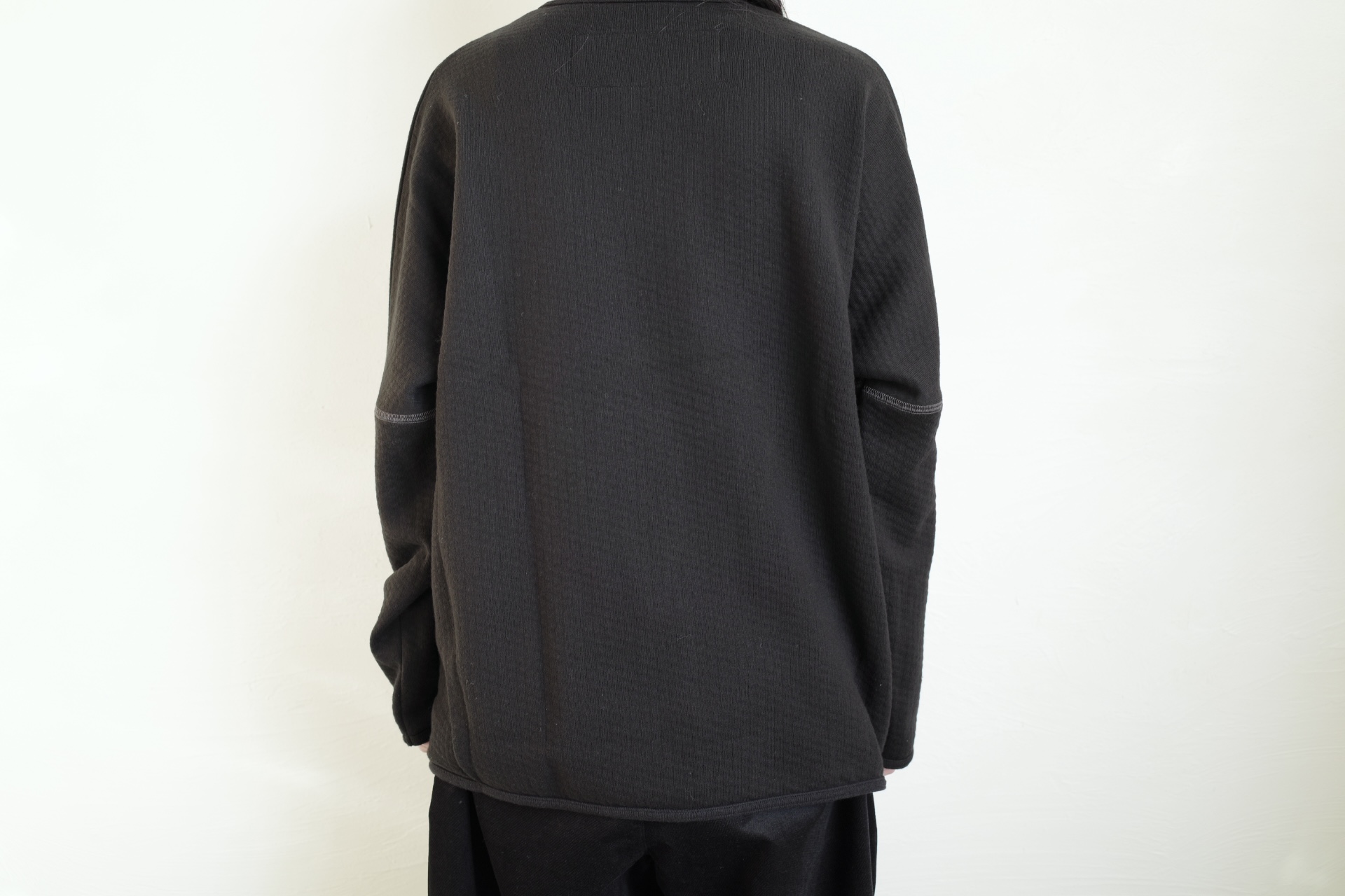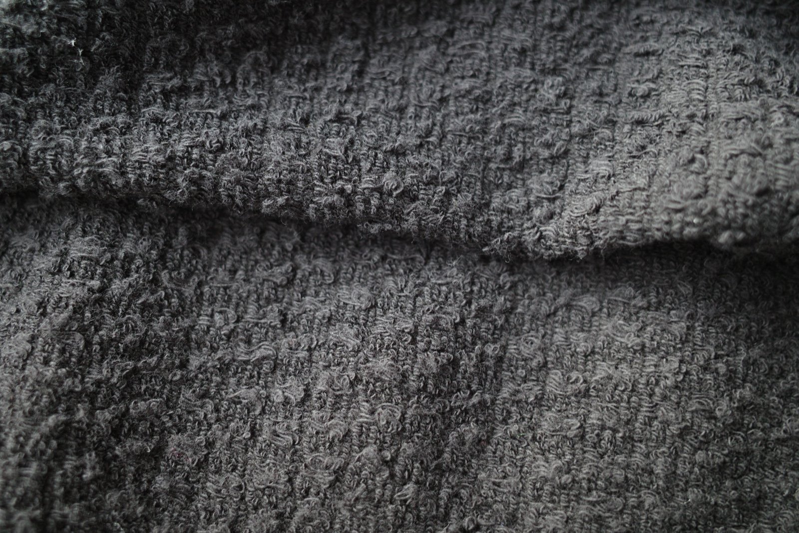 凹凸感のあるランダムな表面の杢調の表情が印象的な裏毛パイル生地を使用。素材感のある表面とは裏腹に、フワッとしたソフトな肌触りはストレスフリーで着用可能です。