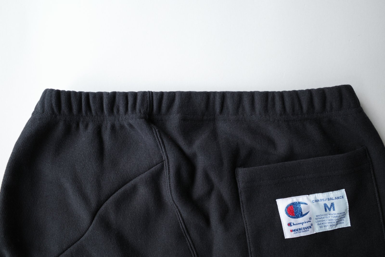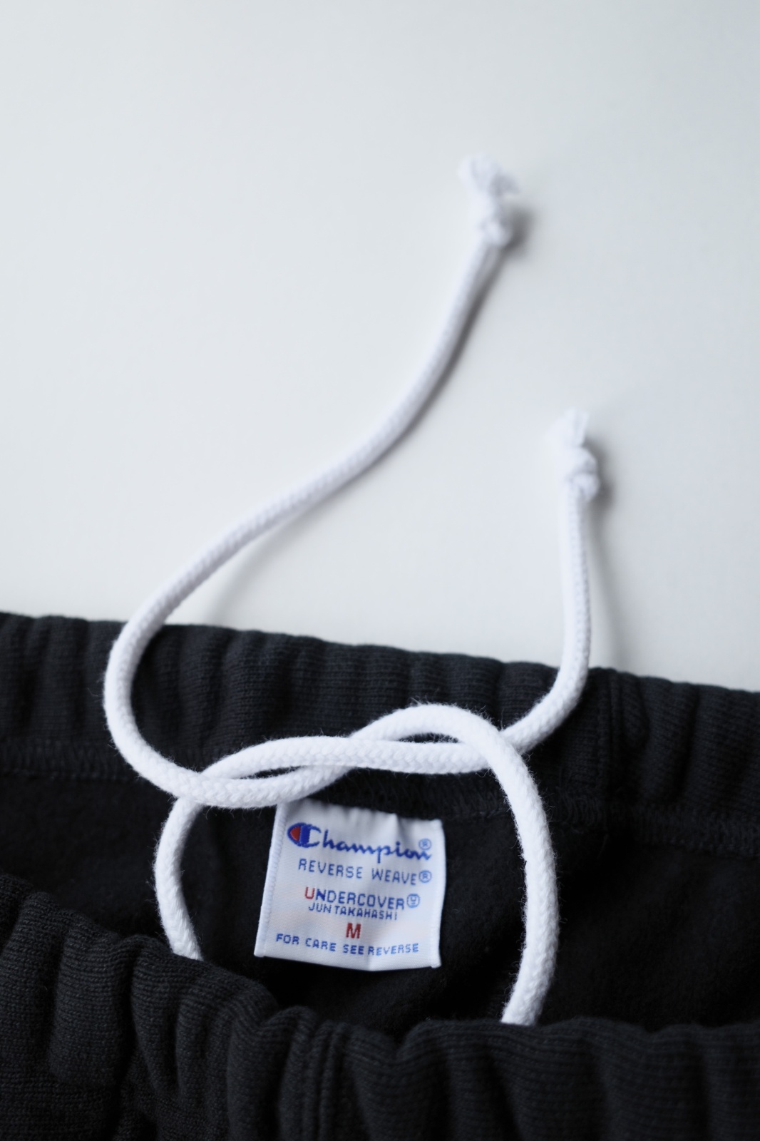 Championとのコラボレーションシリーズ。外に飛び出たタグや、歪んだ縫い目がユニークなデザインは、「but beautiful 4…」と題された同コレクションのコンセプトに合わせたもの。左右非対称なパターンで構成、切り替え部分にはタグを配置。バックにパッチポケットとパッチを。ラグジュアリー感のあるビーズワッペンでChampionロゴを製作。中綿を入れて厚みを出し、立体的なデザインに仕上げました。ウエストはゴム・ドロスト仕様でストレスなく穿けます。裾は絞ってあり足下すっきり。undercoverらしい他にはないアイテムに仕上がっています。UNISEXアイテム。