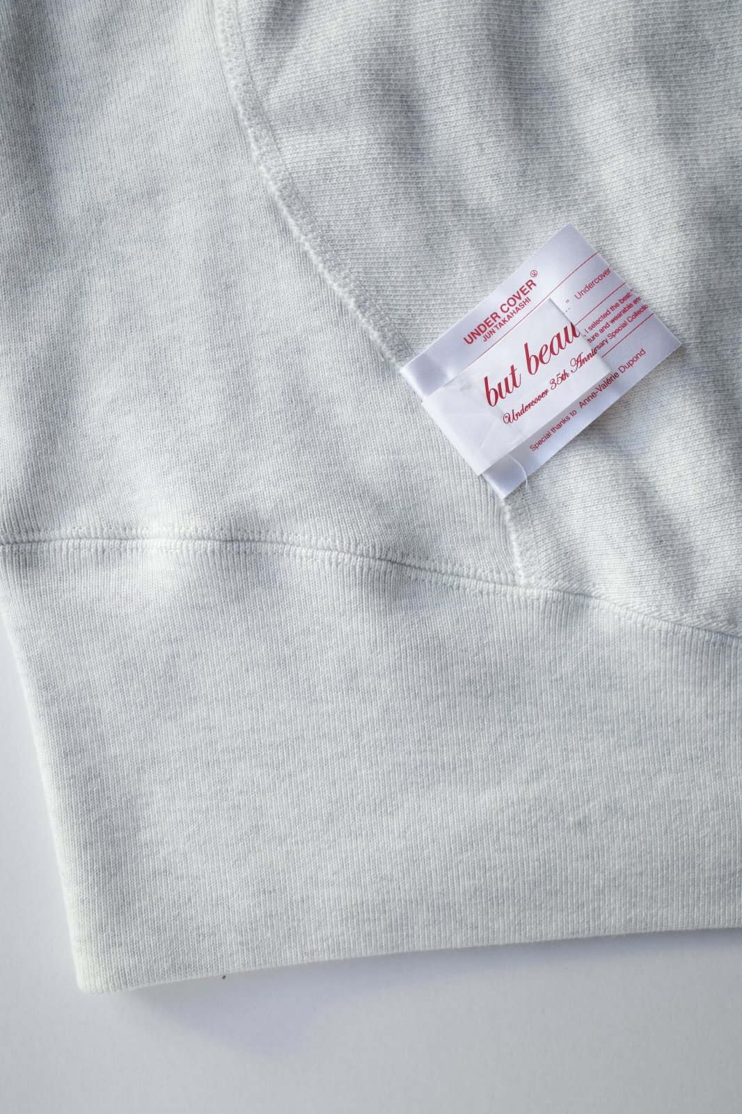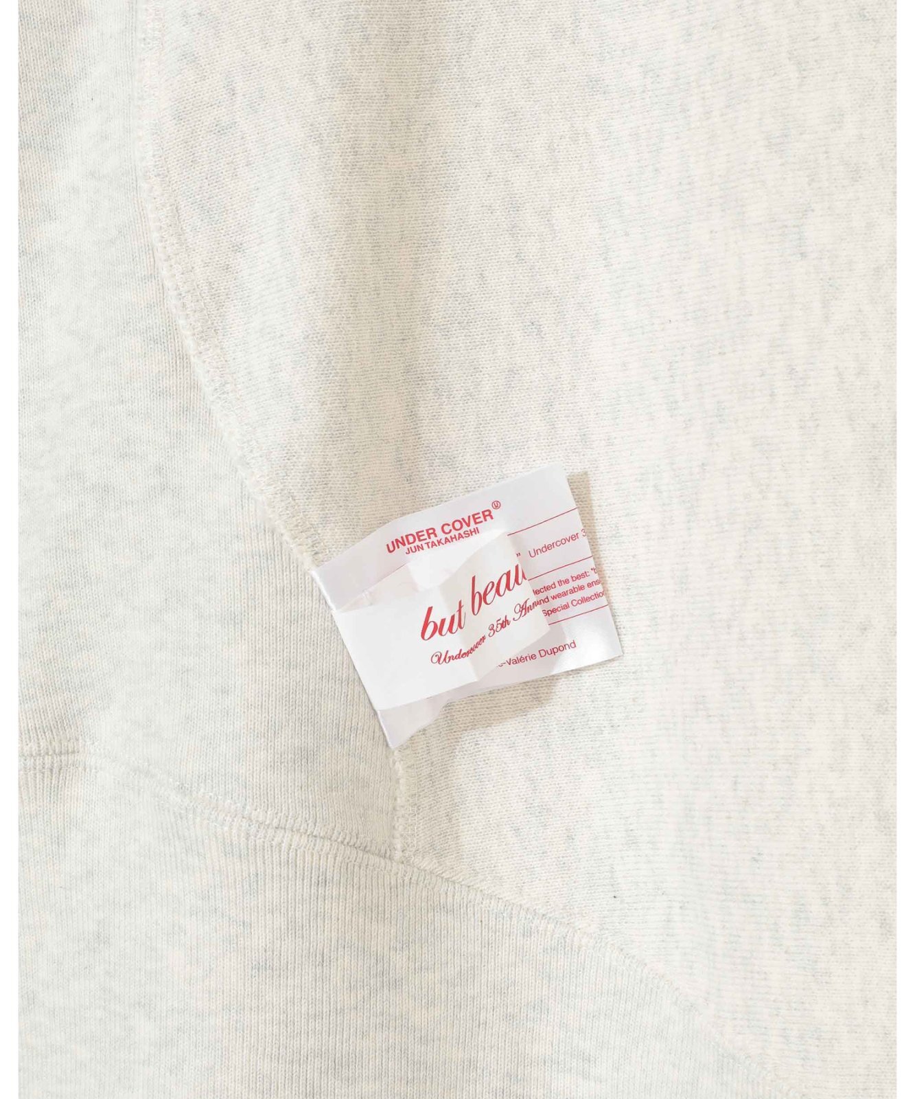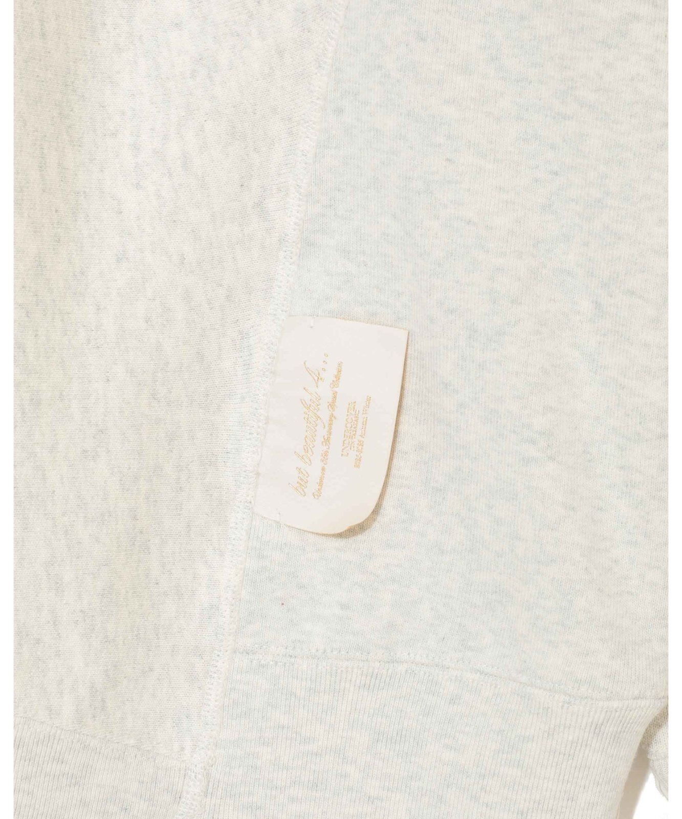 Championとのコラボレーションシリーズ。こちらはフーディーモデル。外に飛び出たタグや、歪んだ縫い目がユニークなデザインは、「but beautiful 4…」と題された同コレクションのコンセプトに合わせたもの。フードも含めて左右非対称なパターンで構成、裾もずれていて切り替え部分にはタグを配置。フロントにパッチを。胸にはラグジュアリー感のあるビーズワッペンでChampionロゴを製作。中綿を入れて厚みを出し、立体的なデザインに仕上げました。袖口にワッペンを、カンガルーポケット付き。undercoverらしい他にはないアイテムに仕上がっています。UNISEXアイテム。