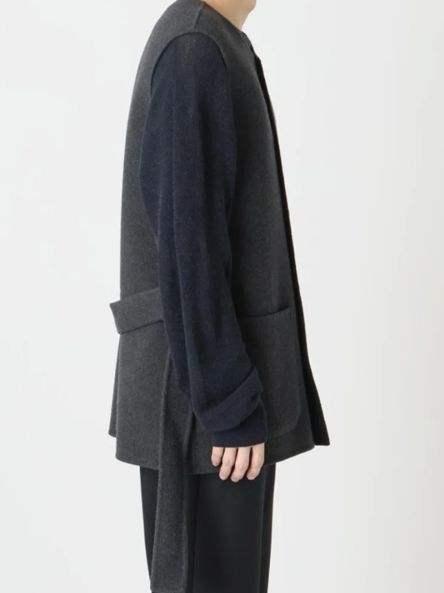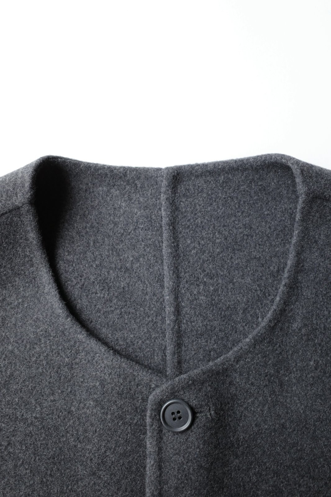 毎シーズン秋冬の定番としてリリースしているリバーシリーズの新作として製作した新型のベストです。毎シーズン秋冬の定番として製作しているリバーシリーズの新作のコートです。sp160sクラスのウール原料を太番手に紡績、撚糸し高密度で織り上げた後、整理加工で柔らかくコシを砕いてモッサー仕上げしたオリジナルの素材。原料からの低温染色、空気を含ませながら高密度で織り付けた生機、丁寧な加工、仕上げまで全ての工程を追求して製作しており、着た際の軽さや肌触りは圧倒的です。工程のほとんどが手作業になるリバー縫製、着丈をやや伸ばした分着こなしに合わせて緩急をつけることが出来るベルト、深みのある色味など、あらゆる着こなしとレイヤーに使うことが出来るバランスを追求しました。