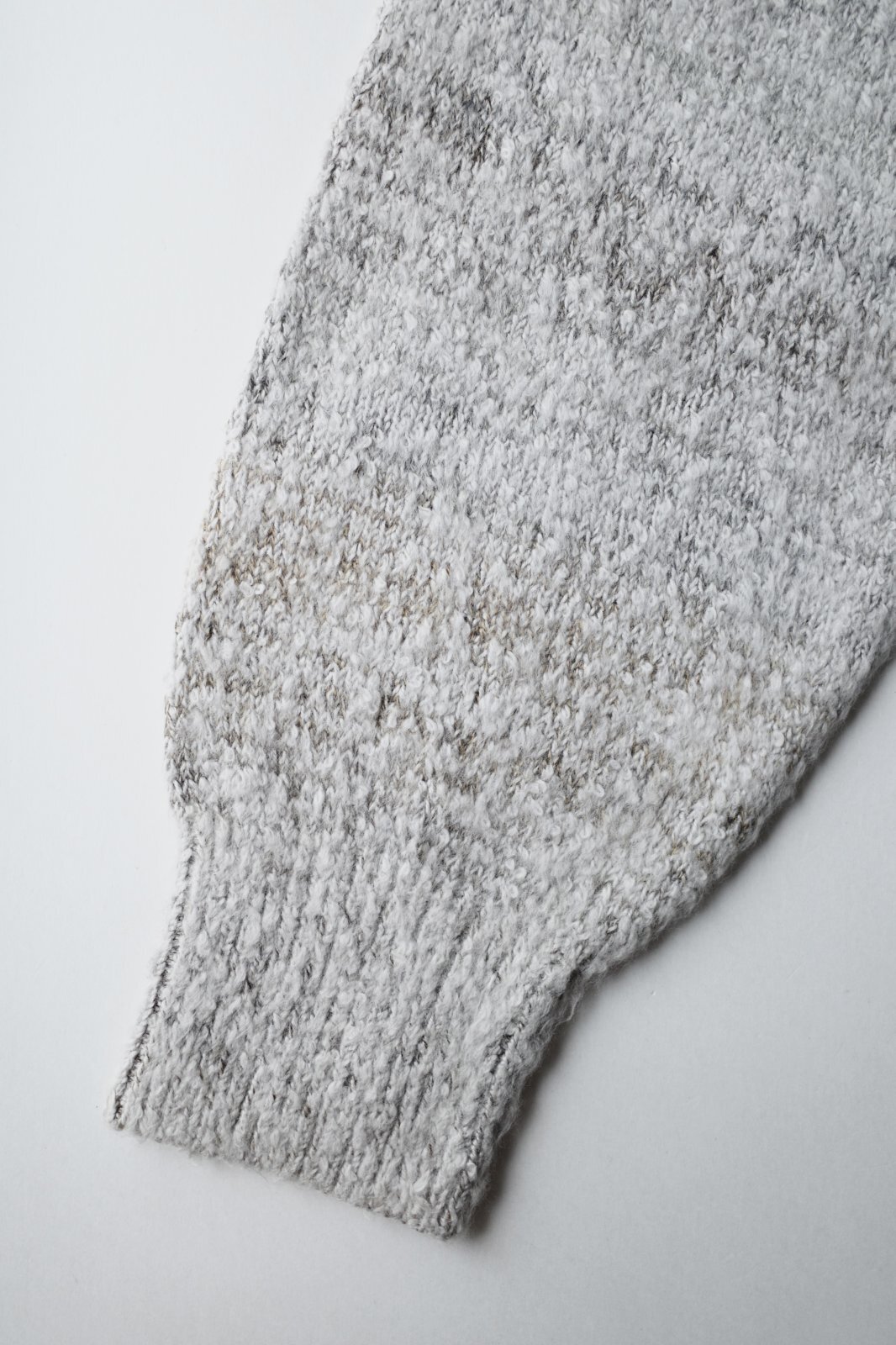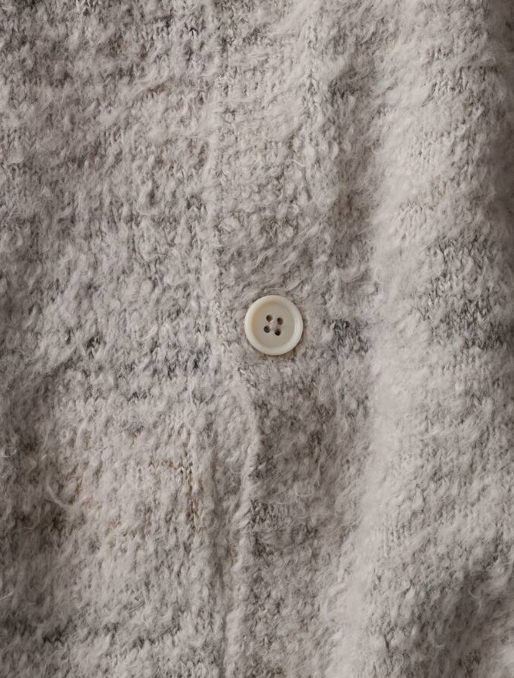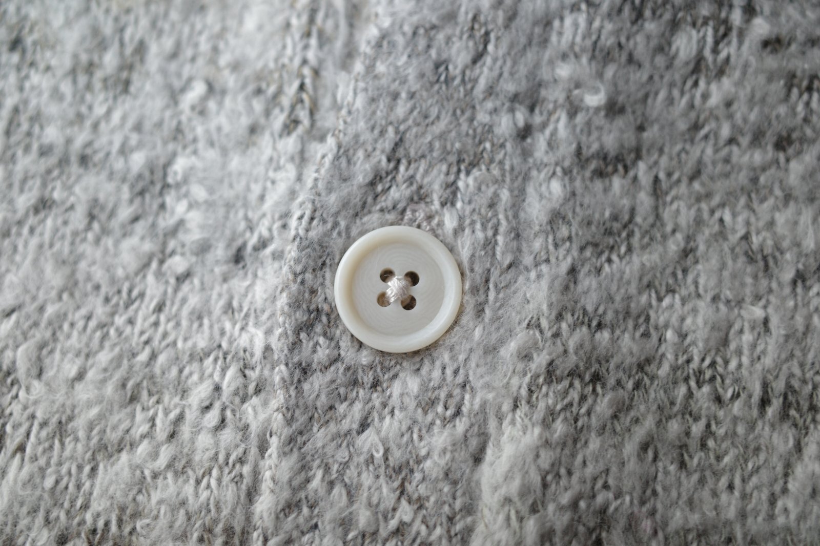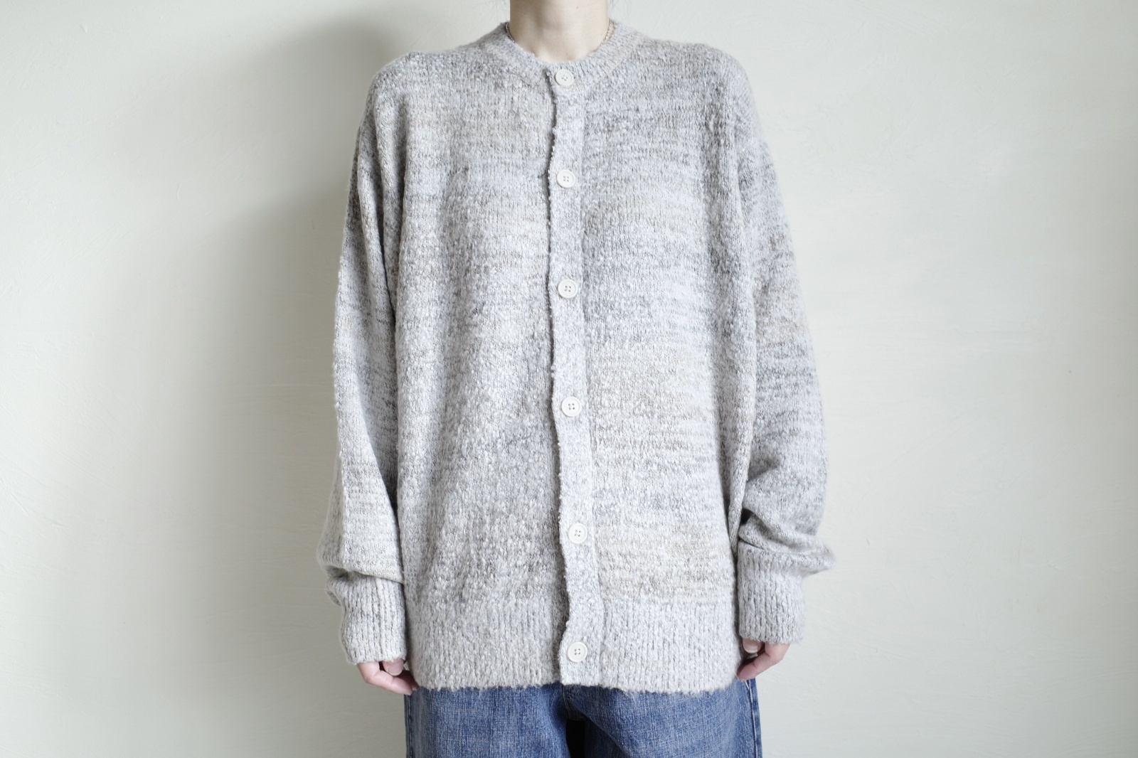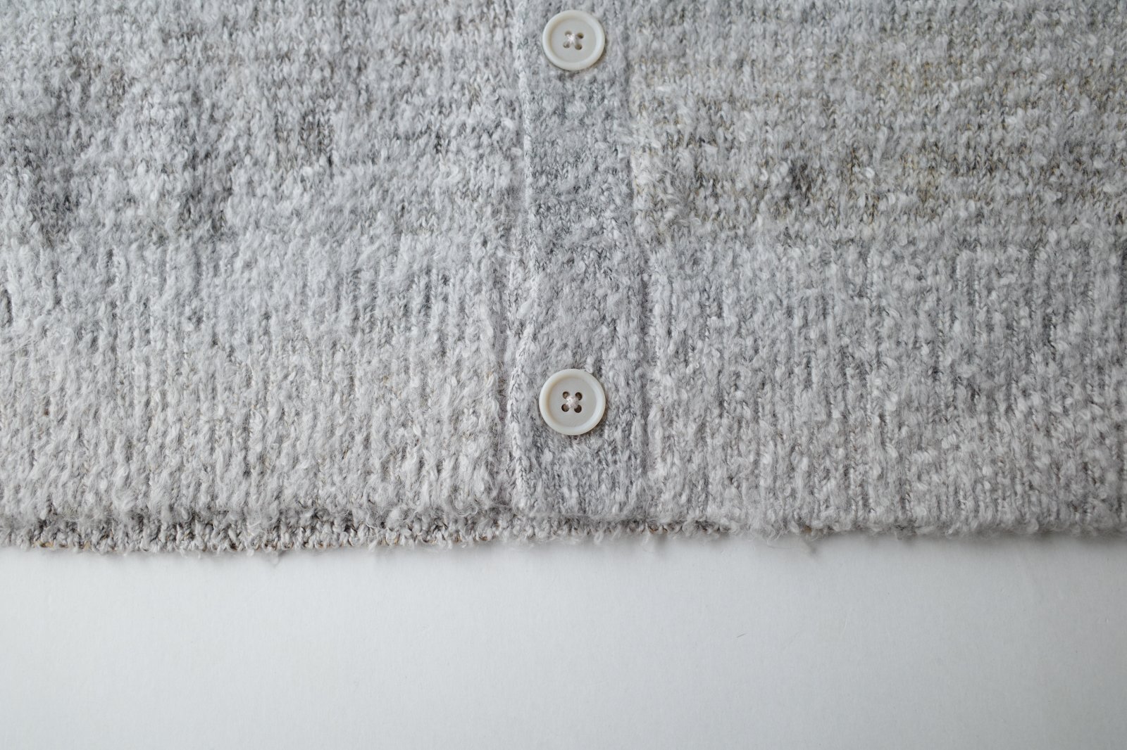 コットンと和紙、レーヨンの3素材を混紡し製作したミックス糸で製作2/48のウールのかすり糸と、6.2/1のオリジナルで紡績した太番手のコットンのモール糸を引き揃えて編み上げて製作したオリジナル素材で製作したチャンキーカラーのクルーネックカーディガンです。独特の生地の陰影、すべて天然素材で仕上げていることでの柔らかい肌触りと軽さ、深みのある発色など独特のバランスが特徴です。クルーネックのカーディガンですがエレガントな印象で着用できるよう肩線を前に設置しているほか、ブルゾンのような丸みのアウトラインにまとめました。