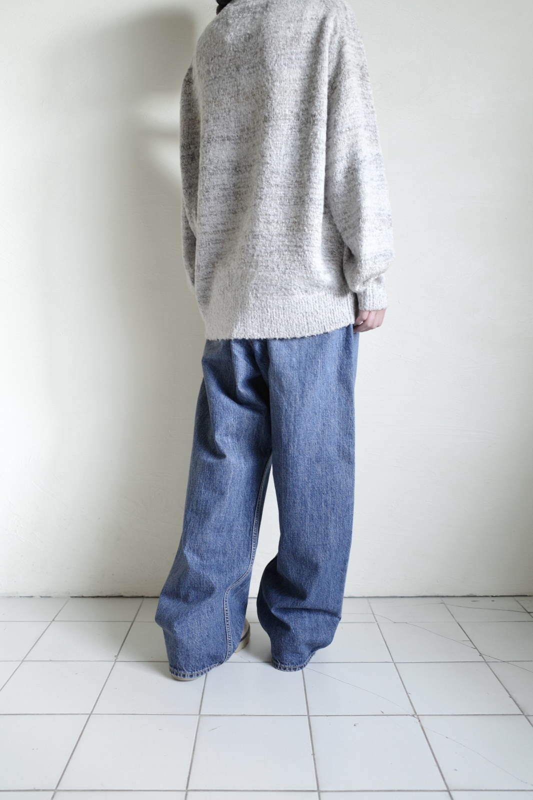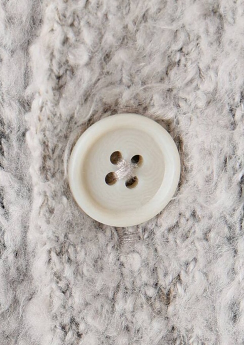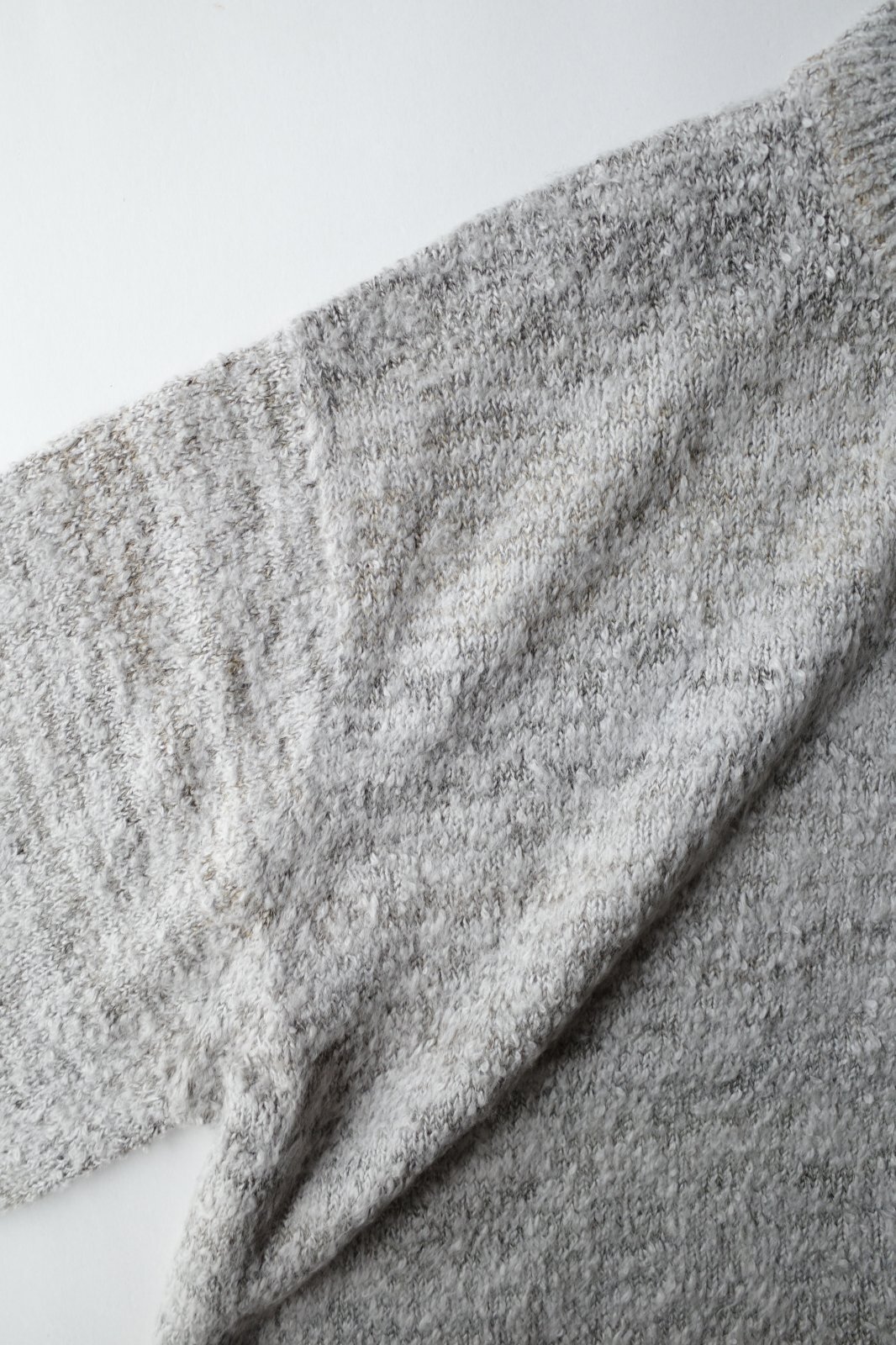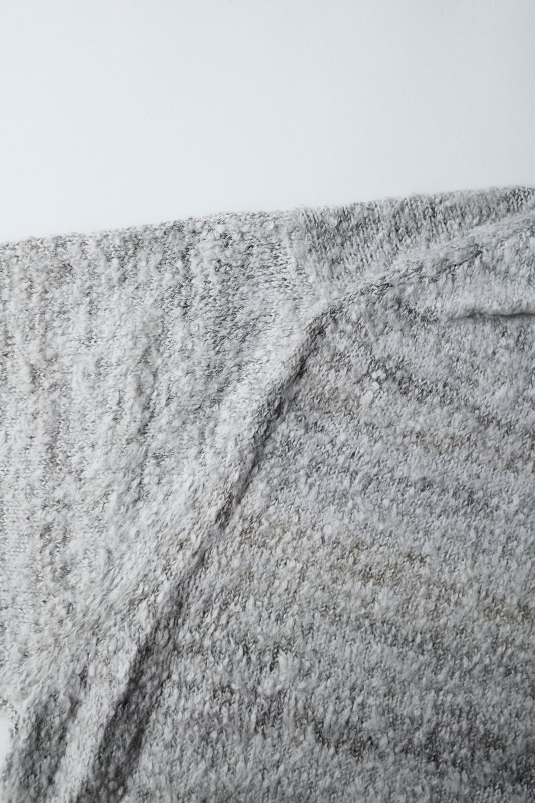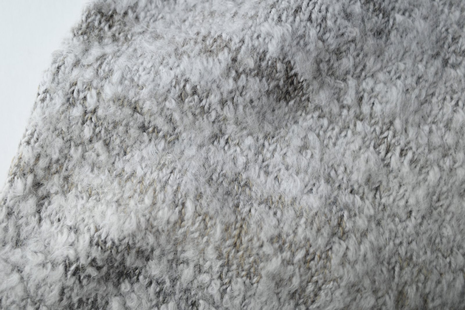 コットンと和紙、レーヨンの3素材を混紡し製作したミックス糸で製作2/48のウールのかすり糸と、6.2/1のオリジナルで紡績した太番手のコットンのモール糸を引き揃えて編み上げて製作したオリジナル素材で製作したチャンキーカラーのクルーネックカーディガンです。独特の生地の陰影、すべて天然素材で仕上げていることでの柔らかい肌触りと軽さ、深みのある発色など独特のバランスが特徴です。クルーネックのカーディガンですがエレガントな印象で着用できるよう肩線を前に設置しているほか、ブルゾンのような丸みのアウトラインにまとめました。