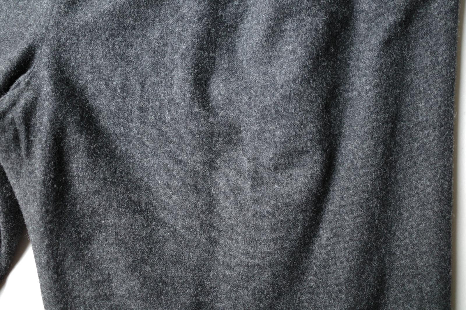 加工を施した縮絨ウール素材を採用。ふんわりやわらかさと肌触りとともに、加工により糸が膨らんでいることで編み目が詰まり防寒性が引き上がっています。味わいのあるウール混テキスタイル。