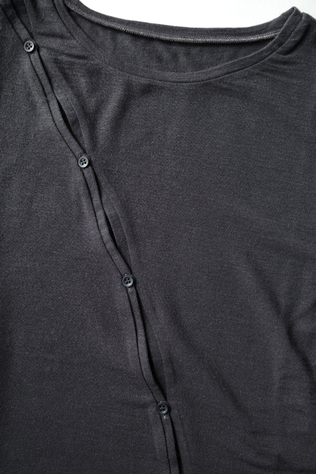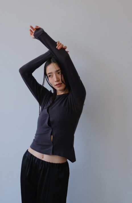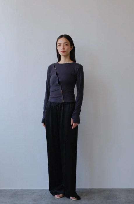 前身頃に配置した斜め開きのデザインがアクセントとなり、シンプルながらもモードなニュアンスを漂わせる一枚。浅めのボートネック風ラインがデコルテを美しく際立たせ、女性らしい印象を引き立てます。袖口には指空きのディテールを配置し、さりげない抜け感をプラス。やや短めの着丈は全体のバランスを取りやすく、スカートにもパンツにもスタイリングしやすいのが特徴。トップスとしてはもちろん、ジャケットのインナーとしても取り入れやすいデザインで、日常のスタイリングに洗練された表情を添えてくれるアイテム。特性状個々で風合い・サイズに若干の差がある場合がありますご了承くださいませ。