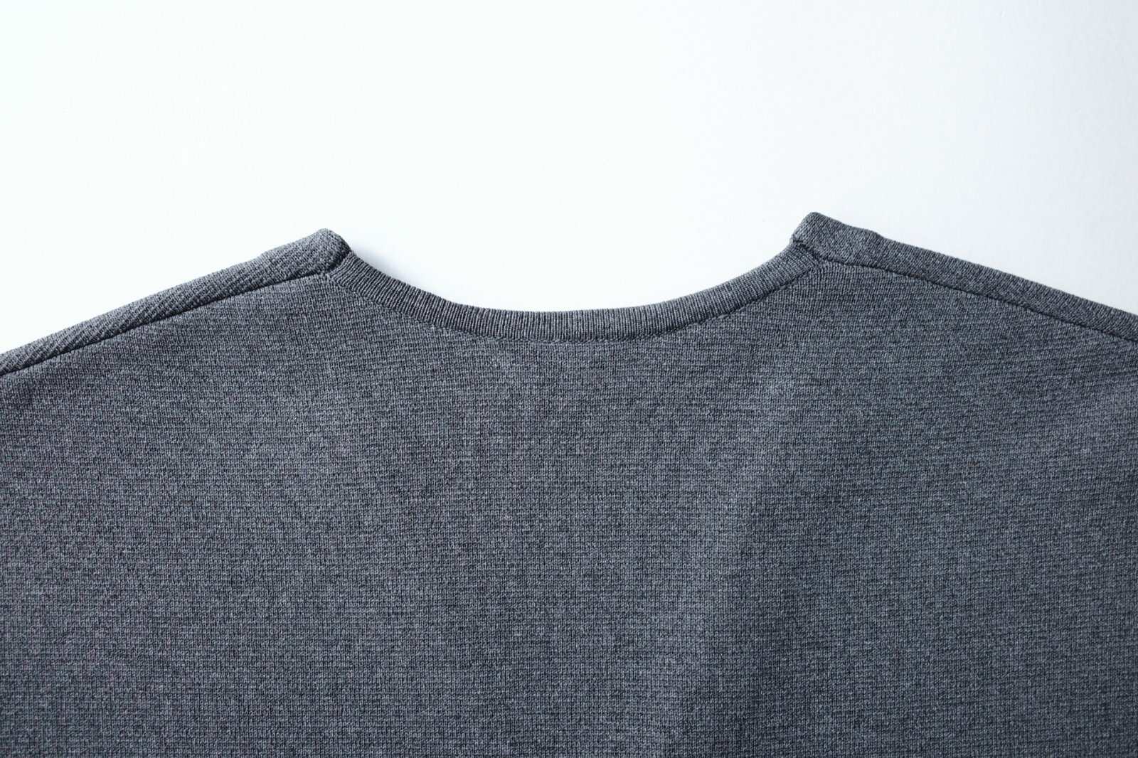 ポリエステル100%の糸を使用し、高密度に編み込むことでハリ感と目面の美しさを追求。驚くほど軽く、シワになりにくいため、旅行や持ち運びにも最適です。高密度ならではの美しいシルエットを保ちながら、着心地は軽やかでストレスフリー。