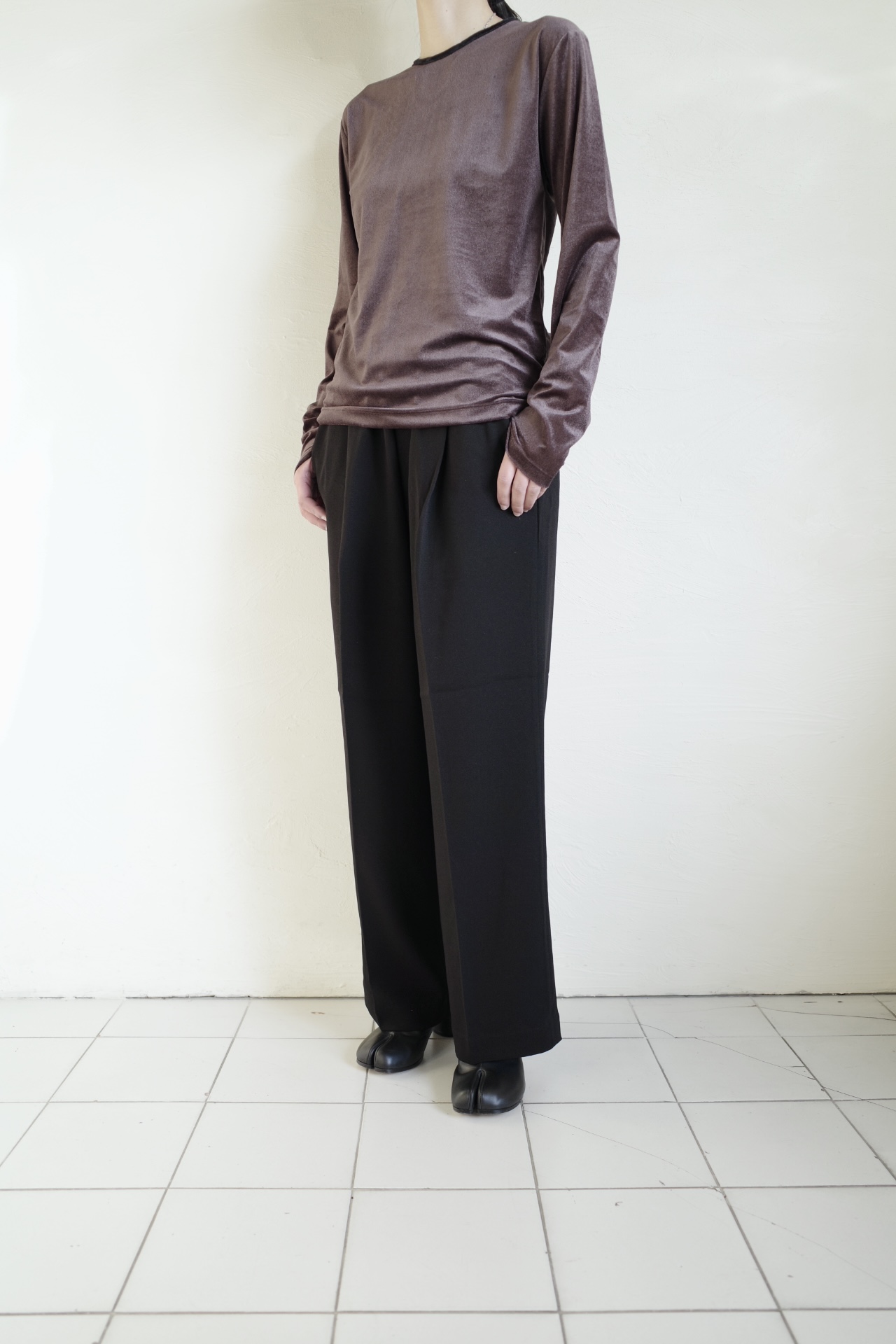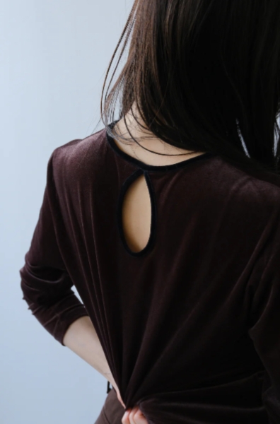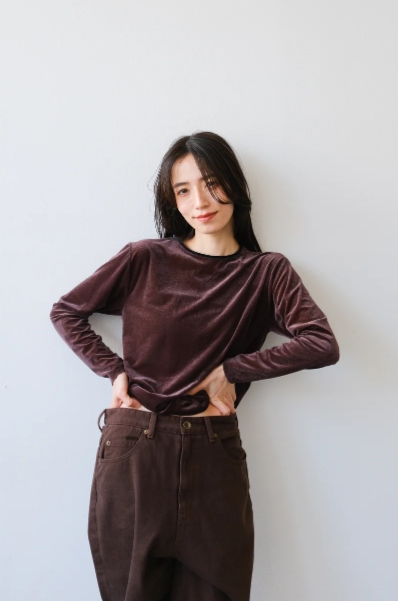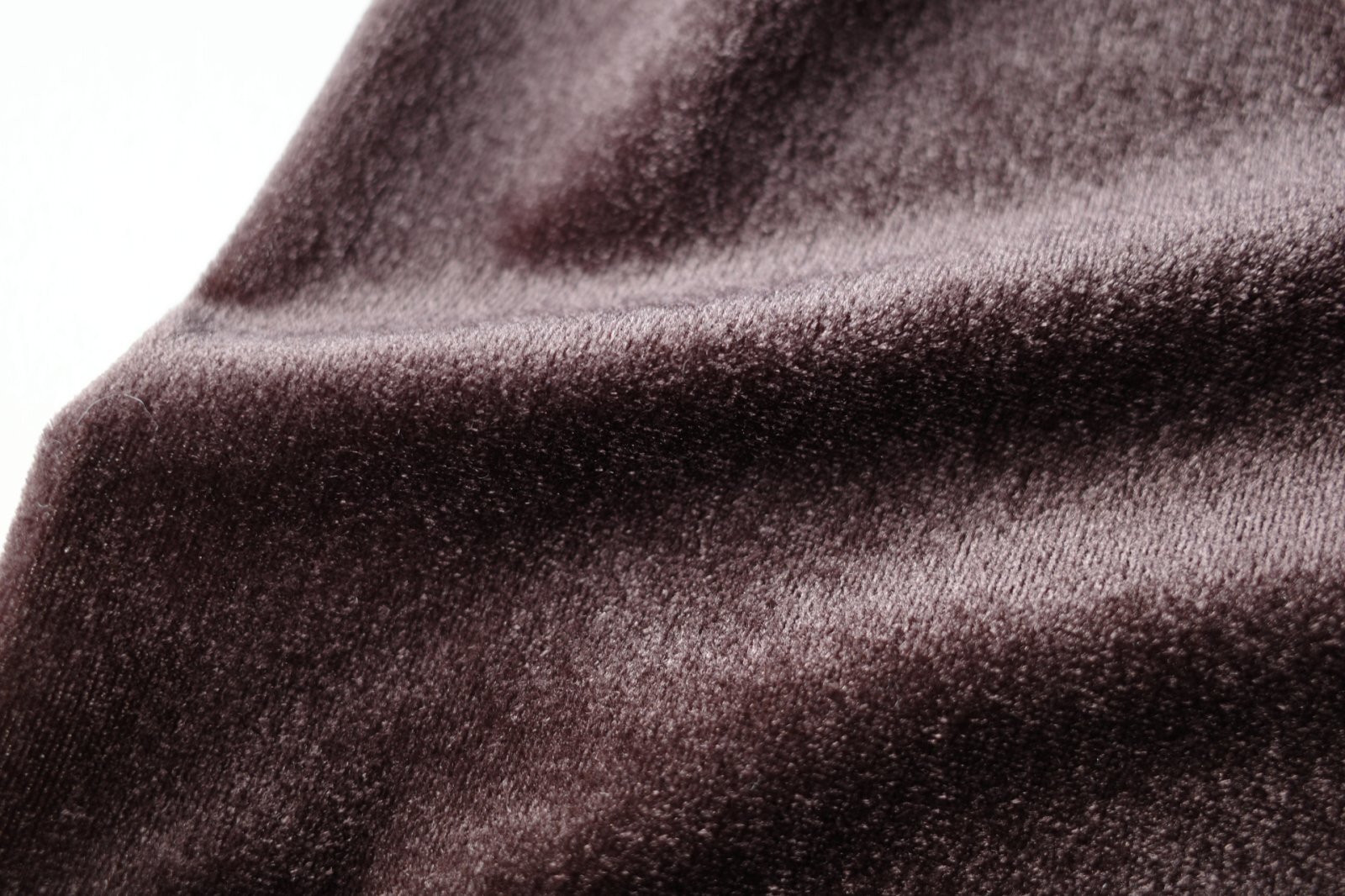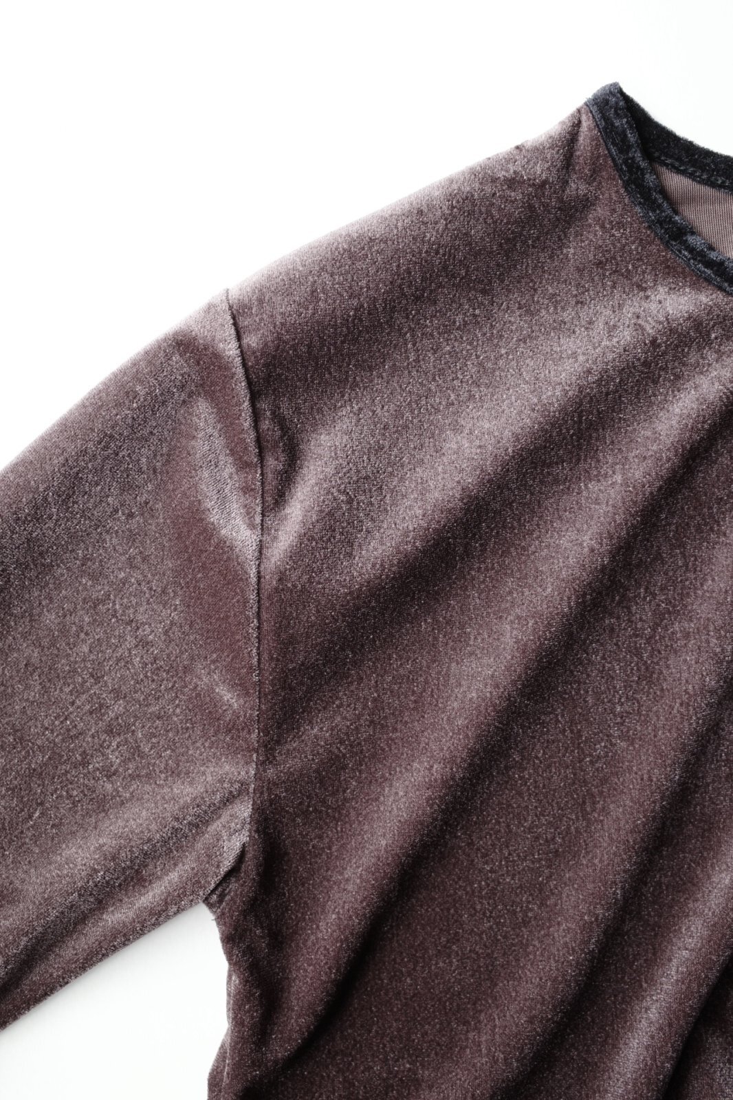 伸縮性があるため着心地がよく、軽やかさと程よい保温性も兼ね備えた素材です。上品なシアー感とベロアの起毛感が、抜け感と華やかさのある印象に。