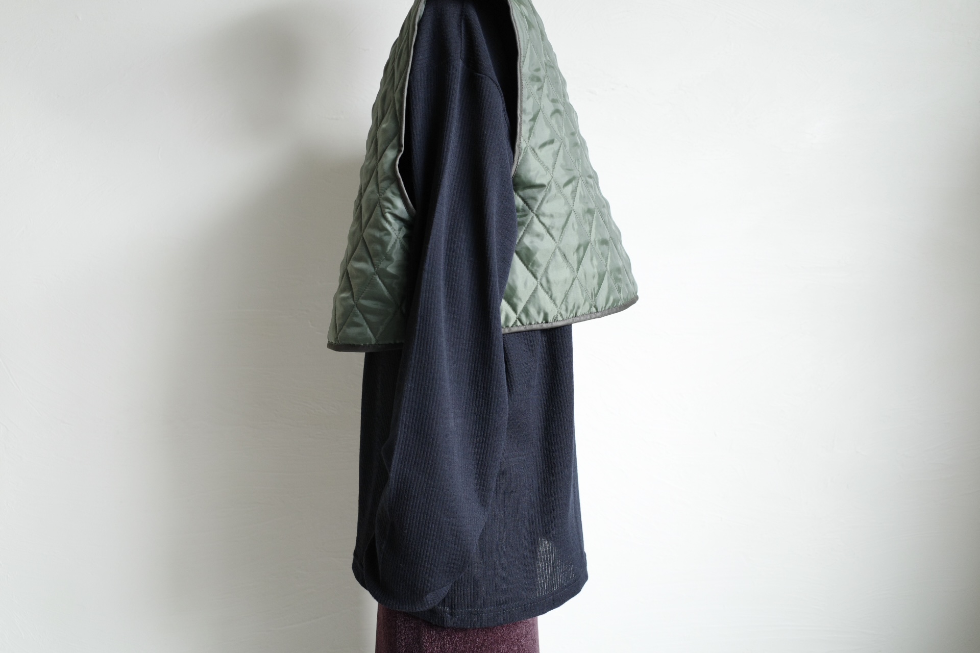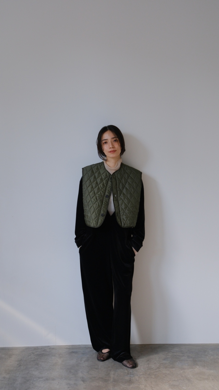 軽い中綿素材のキルティングベスト。ショート丈でお作りしておりますので、モード感のある印象に。スウェットやシャツ、ワンピース、さらにはアウターの上にもレイヤードして様々な着こなしをお楽しみいただけます。
