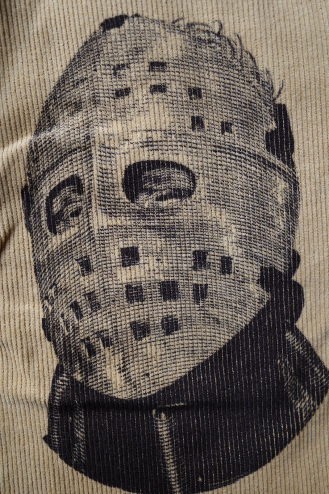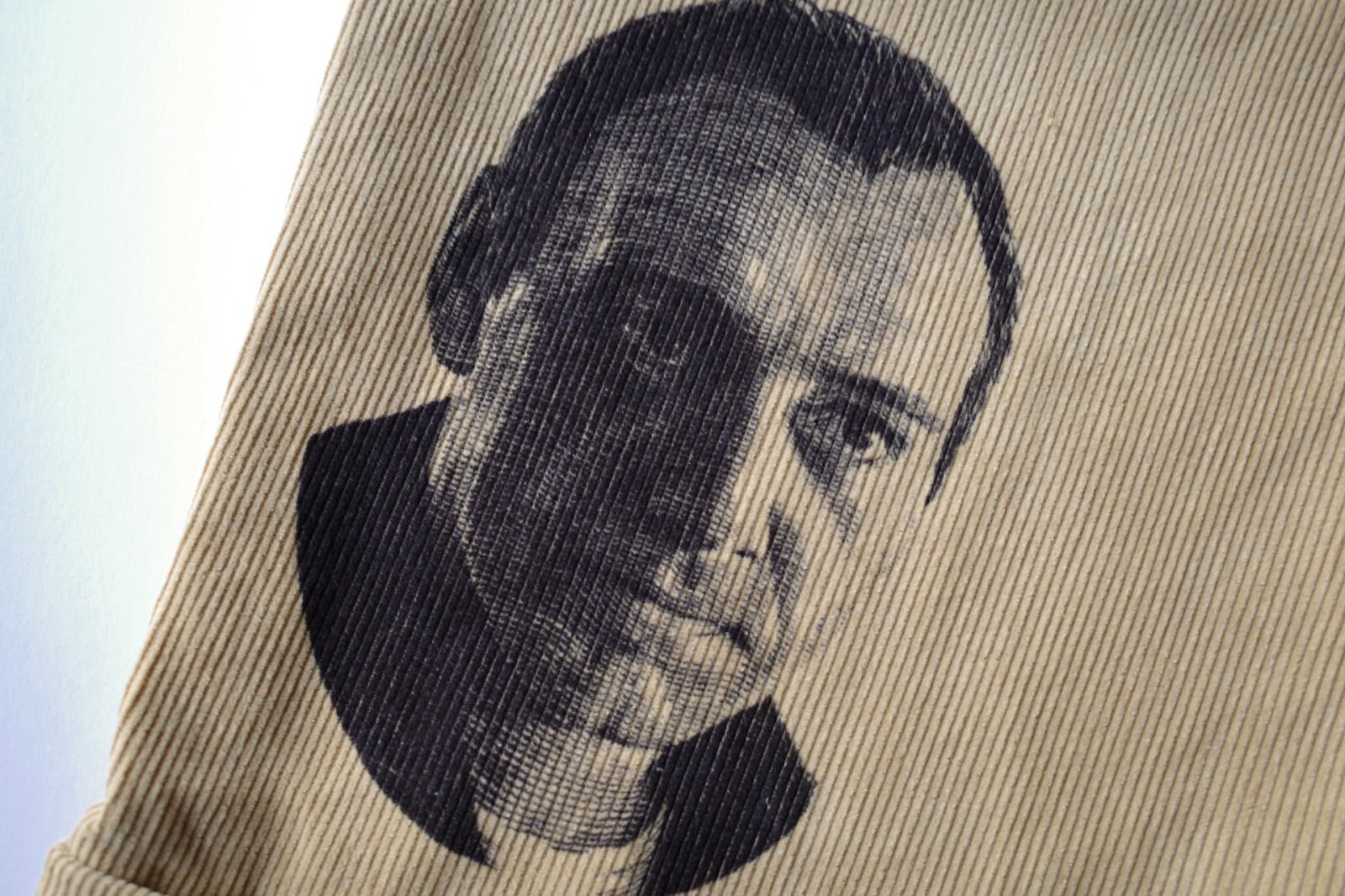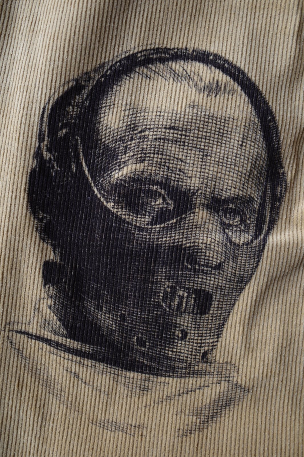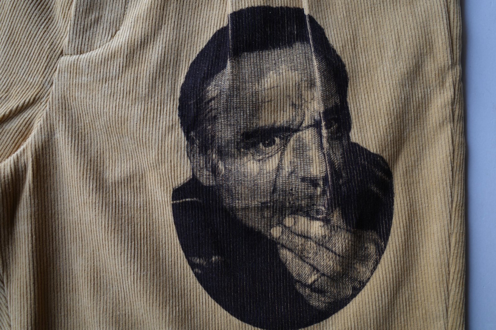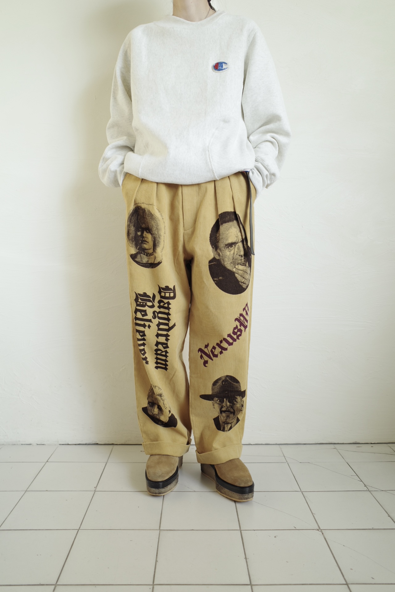 24SSにリリースされ、即完売したBY YOUR SIDE PANTS。今季は、デザイナーと親交の深いアーティスト『NABSF』へ依頼した悪役たちの名グラフィックを配し、アップデートしました。1940年代〜50年代に流行したヴィンテージメモリアルパンツを、イメージして全てオリジナルのアートワークを落とし込んだシルエットにも拘ったツータックコーズスラックスです。