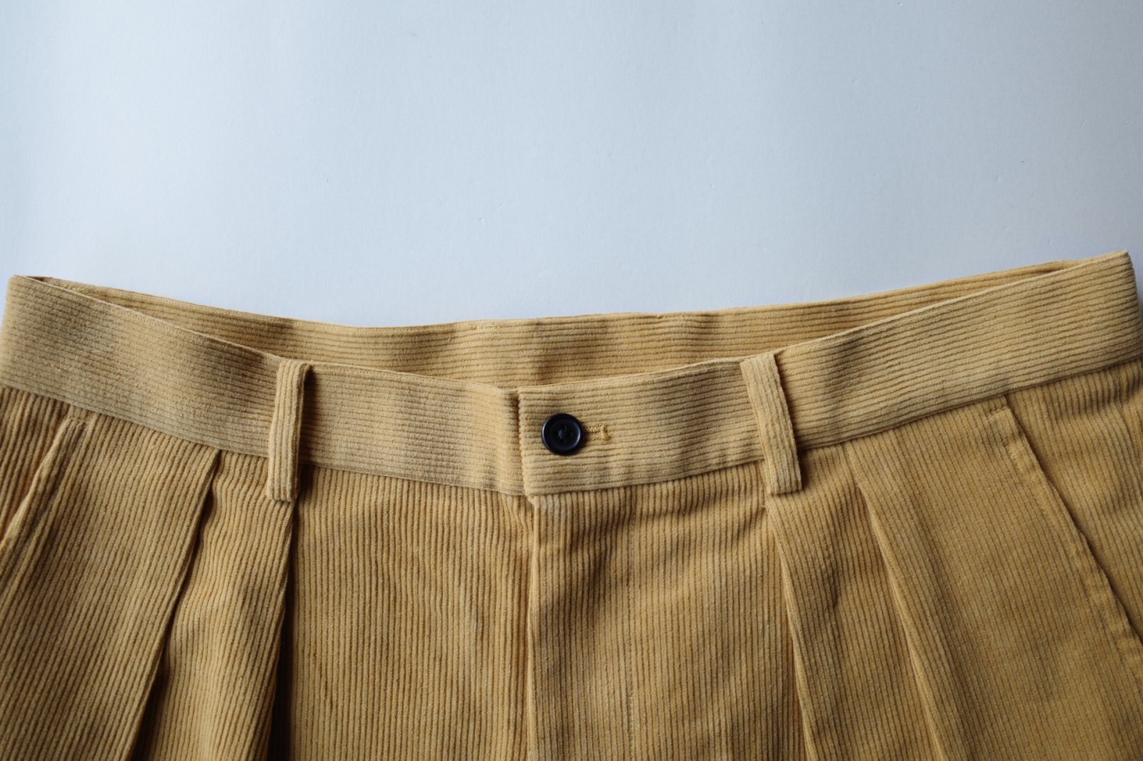 パンツ。コットン100%。細番手のコットンコーデュロイ。独特の毛羽立ちから感じられる光沢とふんわりとした色合いで生地の凹凸感が魅力的。加工を施してヴィンテージ感があるのもポイント。