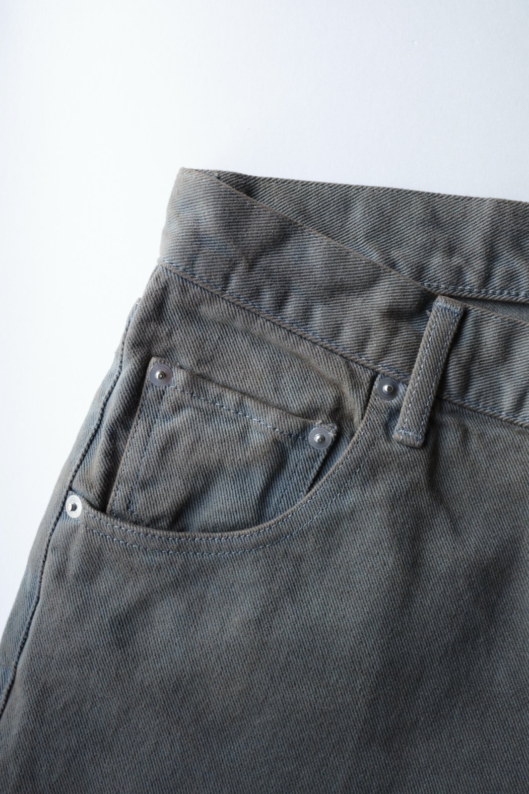 ホワイトデニムをベースに、反応染料と直接染料を重ねた独自のオーバーダイ加工。インディゴのティップ染めでグラデーションを表現し、奥行きのある色ムラと風合いを実現。25SSモデルよりも濃度を高めることで、秋冬の重厚なスタイルにも溶け込む仕上がりに。