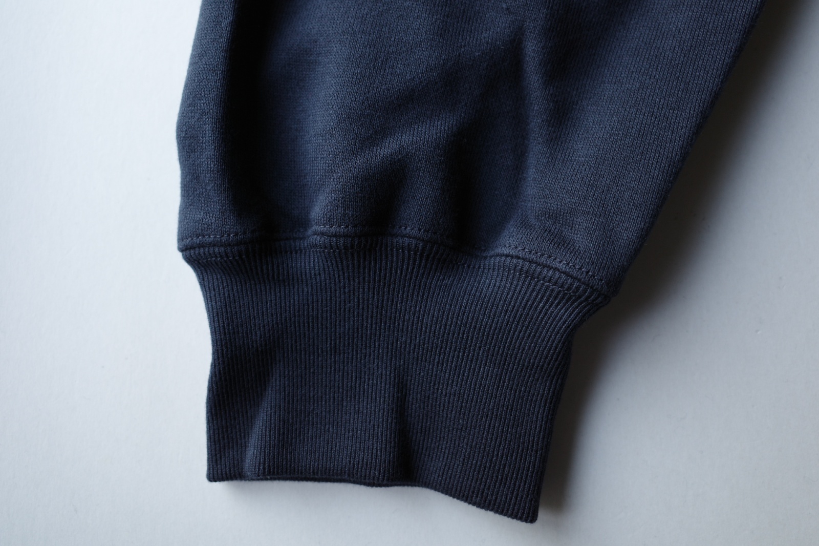 表糸に限界まで甘撚りしたスーピマ糸、裏糸に無撚糸を使用したオリジナルのダブルフェイス素材。旧式のドイツ製編み機でゆっくりと編み上げ、空気を含んだふくらみとしっとりしたタッチを実現。原料由来の自然な光沢感を活かし、低温・長時間で染め上げた深みのあるカラーリング
