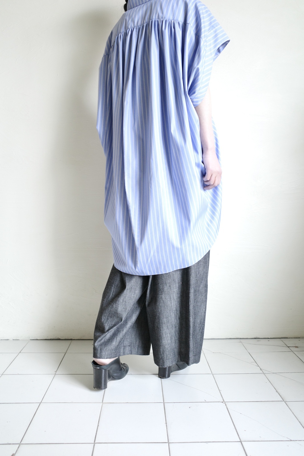 大胆にギャザーを施したバックスタイルが印象的なショートスリーブシャツ。ふんわり丸みを帯びたシルエットは、裾のダーツと前振りのアームホール、狭くした前身頃によって生まれます。ノースリーブよりやや長めの袖丈は、腕まわりをカバーしながら涼やかな着心地を実現。動きに合わせてふんわり表情を変える、静かな存在感を持ったシャツです。